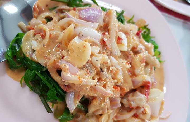 เมนูแกงเผ็ด เราแนะนำ แกงส้มปลา เครื่องแกงส้มที่คลุกเคล้ามาอย่างดี เอาไปทำเป็นต้มแกงส้มใส่ปลา และผักพื้นบ้าน หน่อไม้ ลงไป เคี่ยวสักพักเพื่อให้พักนิ่มลง พอมาเสิร์ฟบอกเลยว่าเครื่องแกงส้มกลิ่นหอมดีมาก ส่วนรสชาติไม่ต้องบอก เผ็ดซี้ดซ้าดมาก ใครชอบของเผ็ดจานนี้ถูกใจ อีกหนึ่งเมนูเผ็ดซี้ด ก็คือ ยำไข่ปลา ไข่ปลาที่เอามาทำเป็นยำ ใส่มะม่วงและเครื่องยำอื่นลงไป รสชาติเปรี้ยว เผ็ด กำลังดี